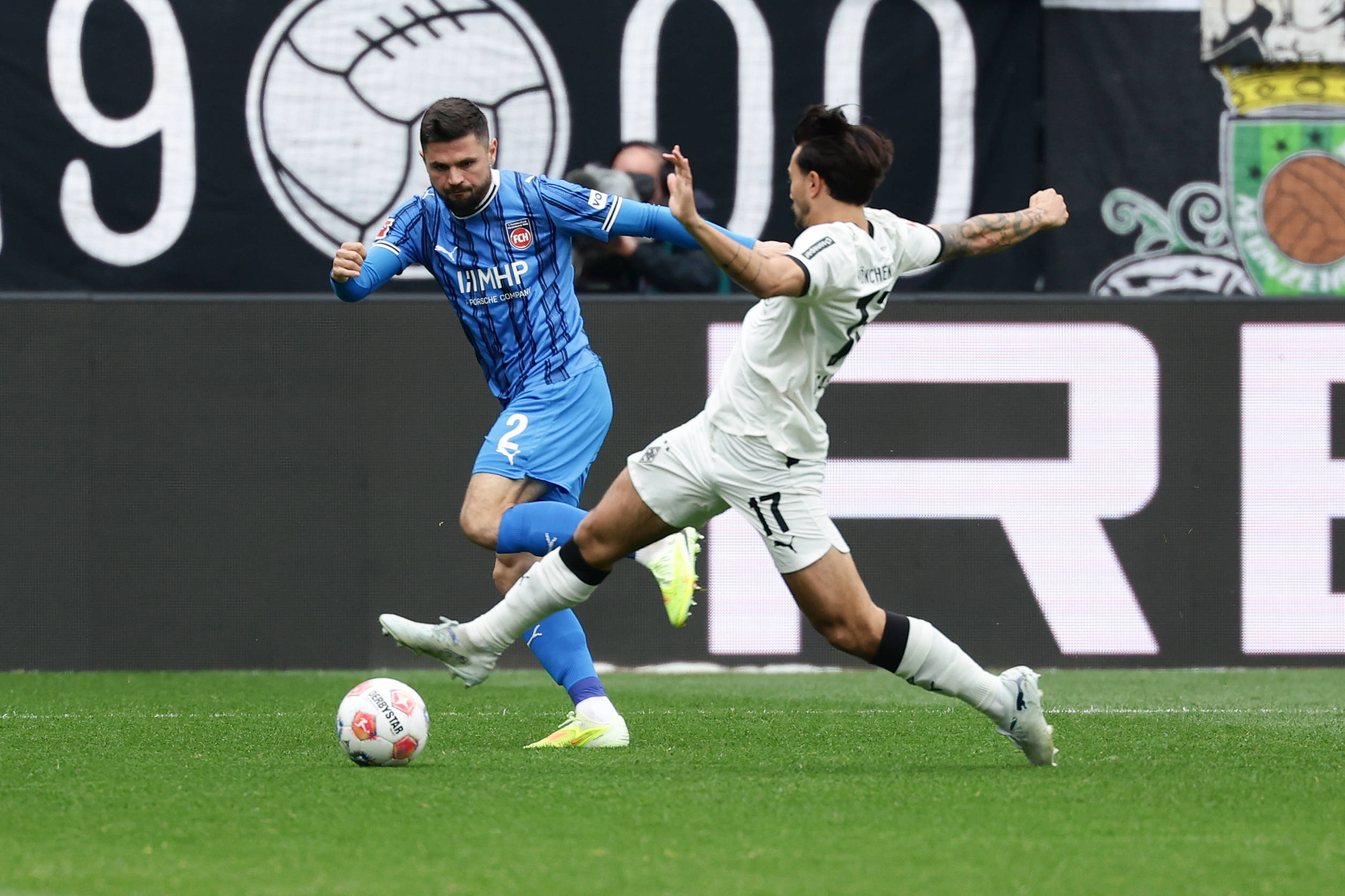 4月4日,门兴格拉德巴赫队球员奥诺拉(左)和海登海姆队球员弗伦巴赫在比赛中拼抢。 新华社发(约阿希姆·毕瓦勒兹摄)